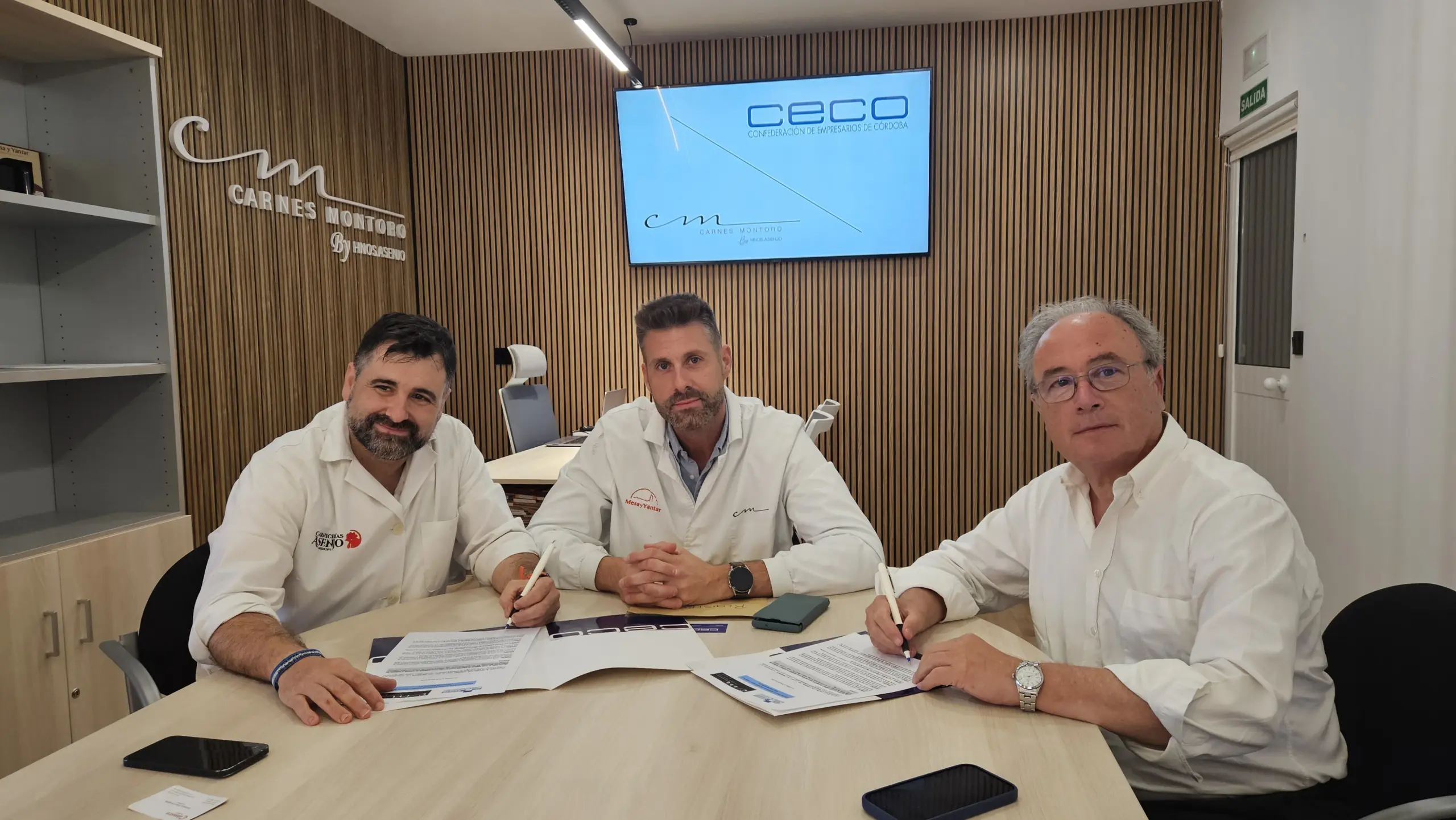 Antonio Díaz, presidente de la Confederación de Empresarios de Córdoba, y los hermanos Asenjo, Luis y Victoriano,   representantes de Carnes y Fábrica de Embutidos Montoro S.L., han suscrito el convenio de colaboración mediante el cual la empresa se incorpora como miembro asociado a CECO.