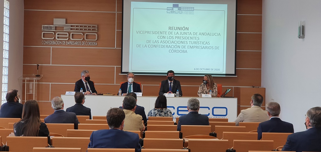 El Centro de Formación, Iniciativa y Apoyo a la Actividad de CECO acoge un encuentro entre el representantes empresariales del sector turístico de Córdoba y provincia y Juan Marín, vicepresidente de la Junta de Andalucía y consejero de Turismo, Regeneración, Justicia y Administración Local. Los empresarios tiene la oportunidad de trasladarle sus inquietudes y propuestas, además de ponen en común la realidad del sector en la provincia de Córdoba.