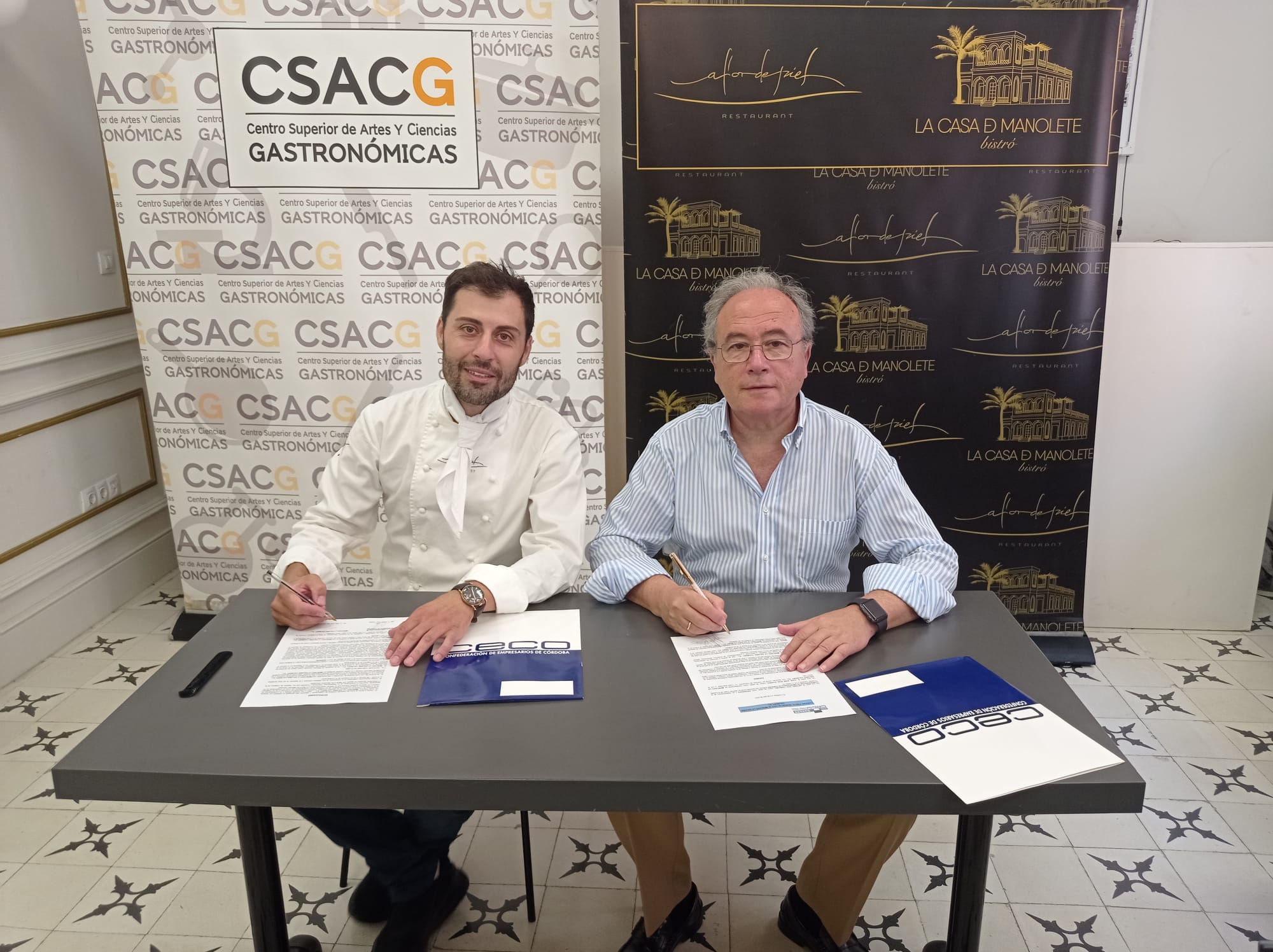 Antonio Díaz, presidente de la Confederación de Empresarios de Córdoba, y Juan José Ruíz, en representación de La Casa Manolete bistró, han suscrito el convenio de colaboración mediante el cual la empresa de restauración gastronómica se incorpora como miembro asociado a CECO.
