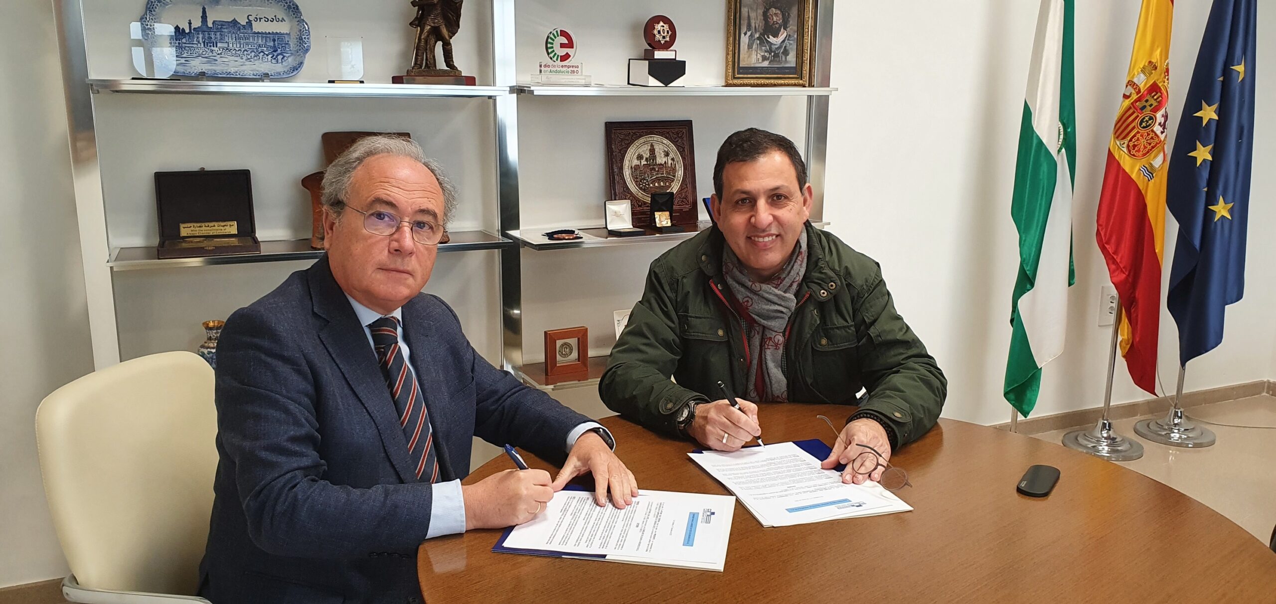 Antonio Díaz, Presidente de la Confederación de Empresarios de Córdoba y Ildenfonso León, Consejero delegado de Segurcolfax S.L., han suscrito el convenio para su incorporación en calidad de miembro asociado.